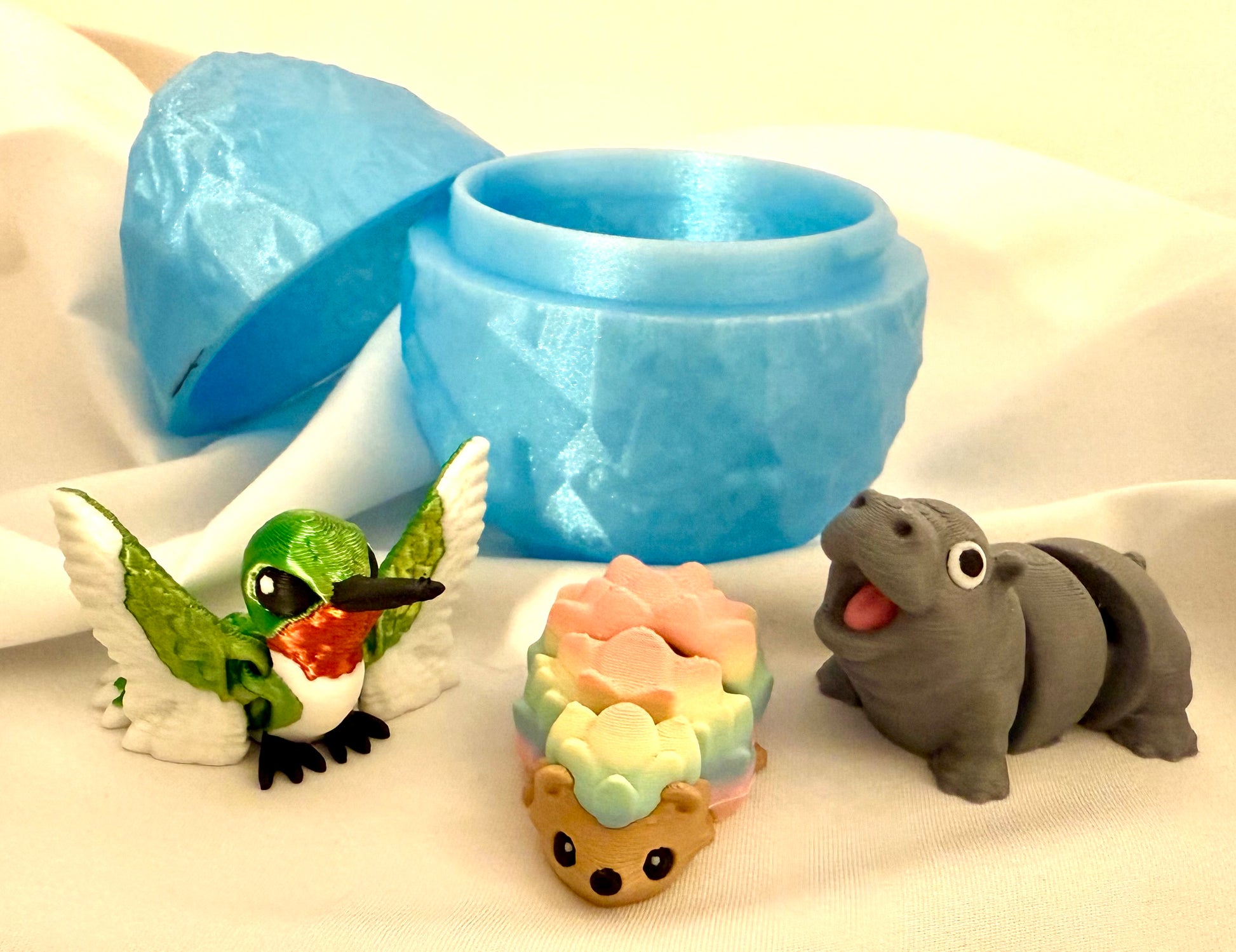 Looking for a fun and unique surprise? Our 3D-printed Mystery Eggs are packed with adorable tiny critters, making them the perfect gift or collectible! Each egg is custom-printed in vibrant colors, ranging from rainbow blends to sleek two- and three-toned designs. Inside, you'll find an assortment of our handcrafted 3D-printed critters—each one a delightful surprise!