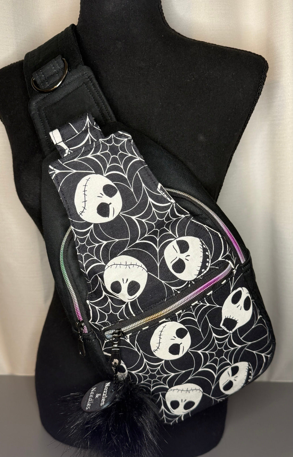 Accented with iridescent zipper detailing and finished with sleek black canvas and hardware, this bag balances spooky style with everyday function. Whether you're headed to a convention, grabbing coffee, or just embracing your inner goth, this sling bag makes a bold statement wherever you go.