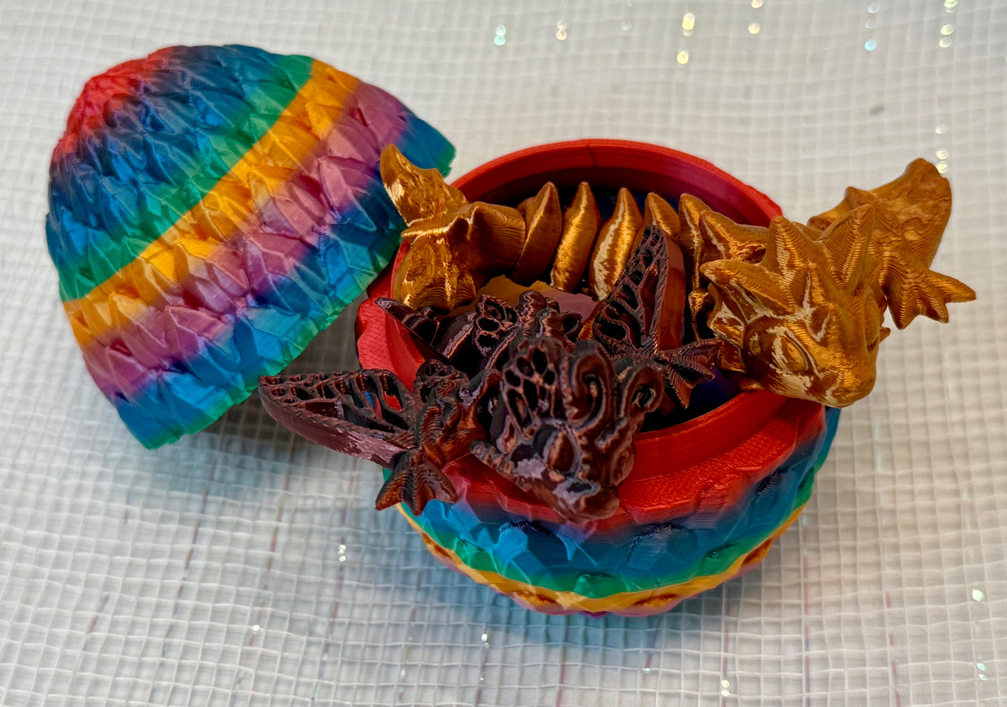 Unleash a bit of fantasy this season with our enchanting Mystery Dragonscale Eggs – perfect for imaginative collectors, fantasy lovers, or magical gift-giving this spring! Each egg is 3D Printed with stunning scale-like textures in vibrant colors and hides a surprise creature within. The mystery? You never know which magical dragon companion you'll discover!