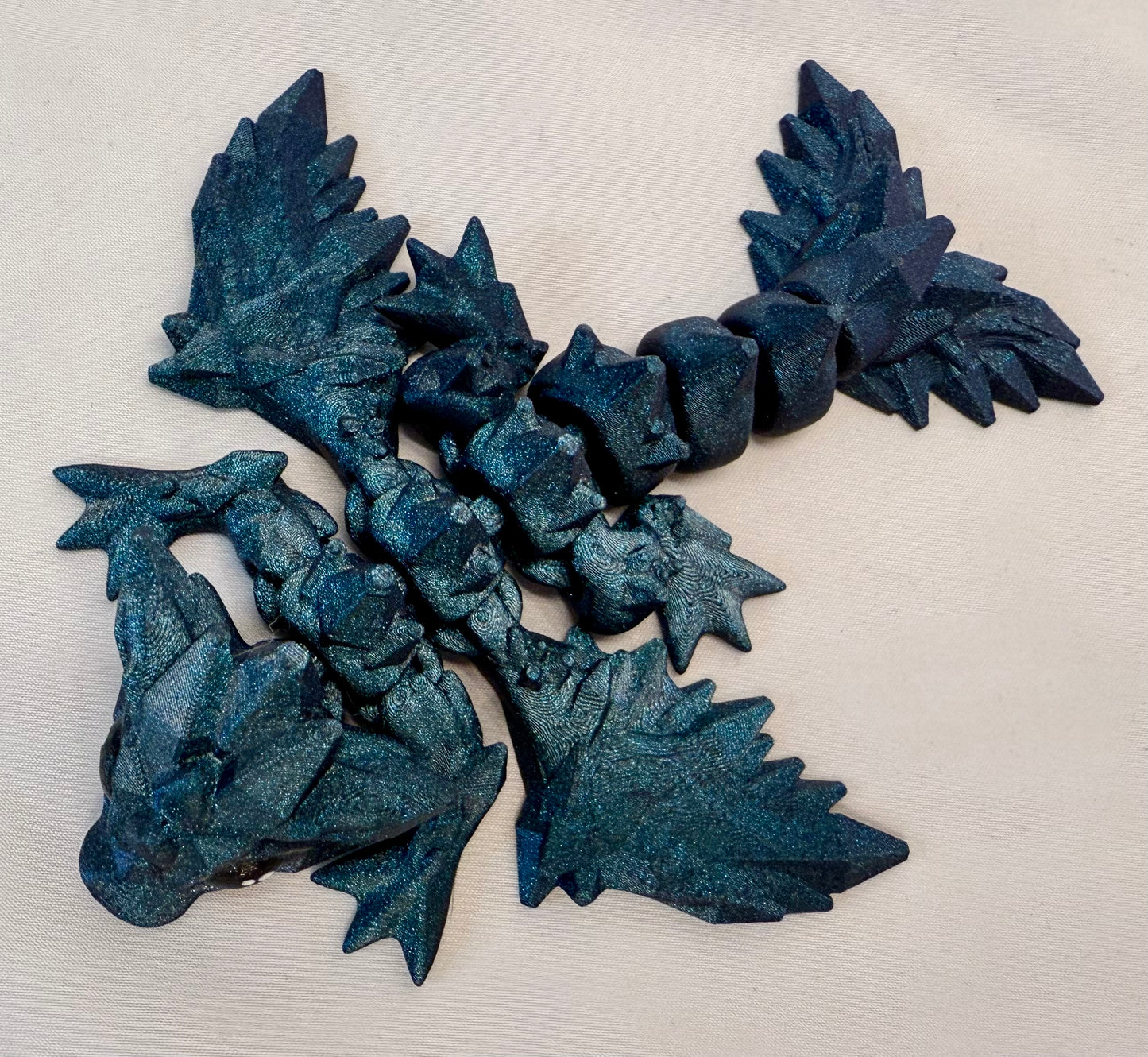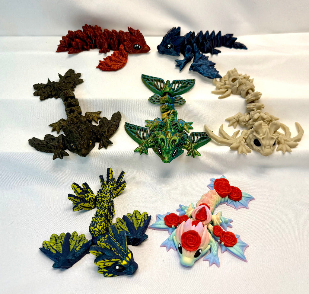 Add a touch of mythical magic to your shelf or collection with these vibrant, poseable tiny dragons and wyverns! These fantasy creatures are 3D printed in a variety of colorful styles, each just over 5 inches in length and fully articulated for flexible posing.